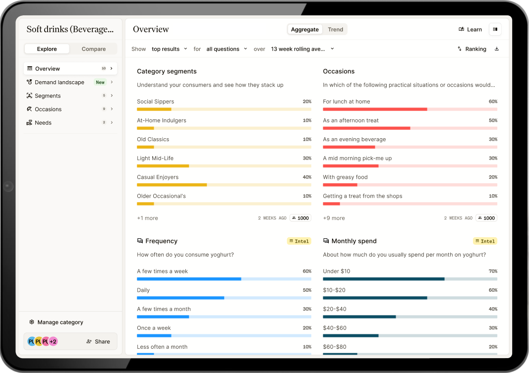 Test concept variations with confidence, benchmark them against internal or industry data to find distinctive attributes, and develop comprehensive stories.